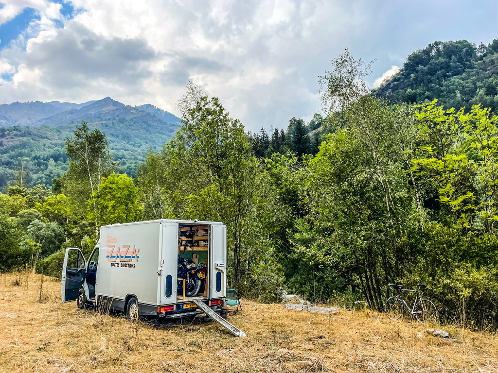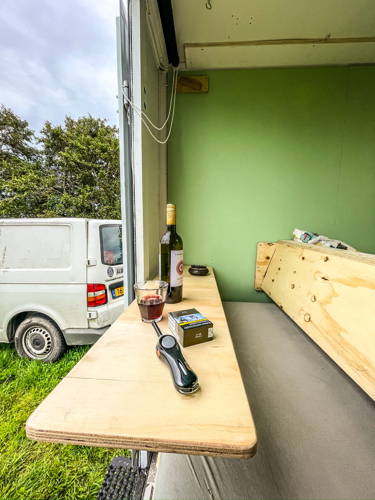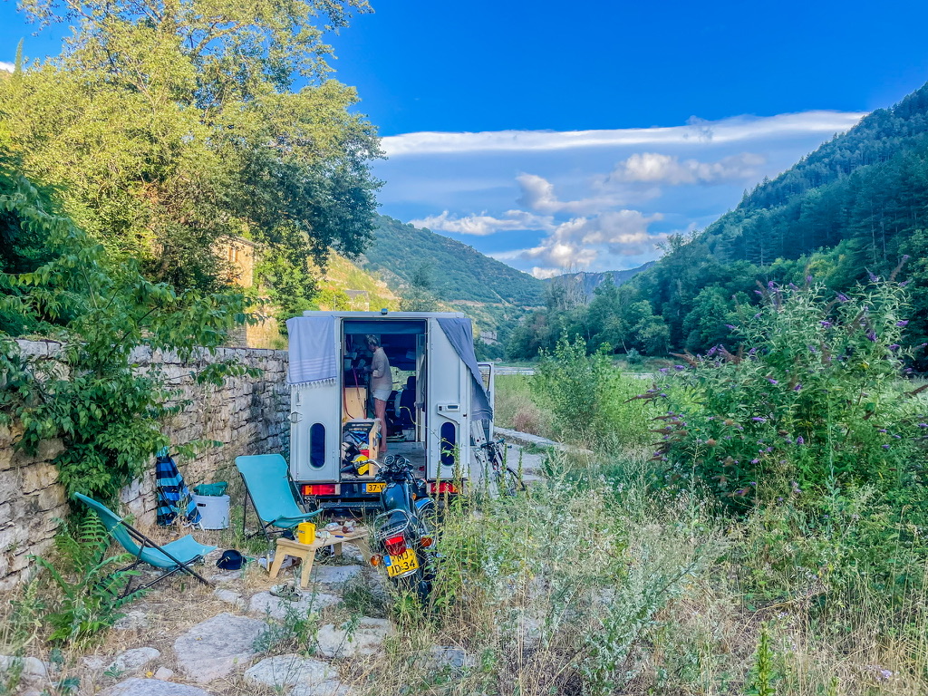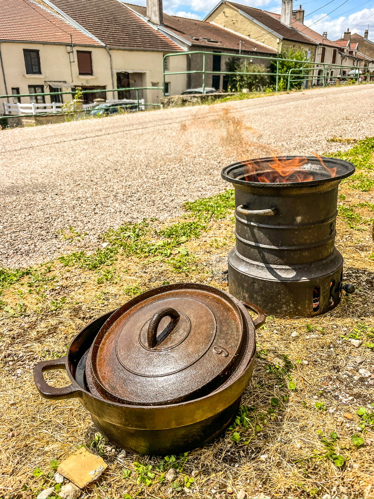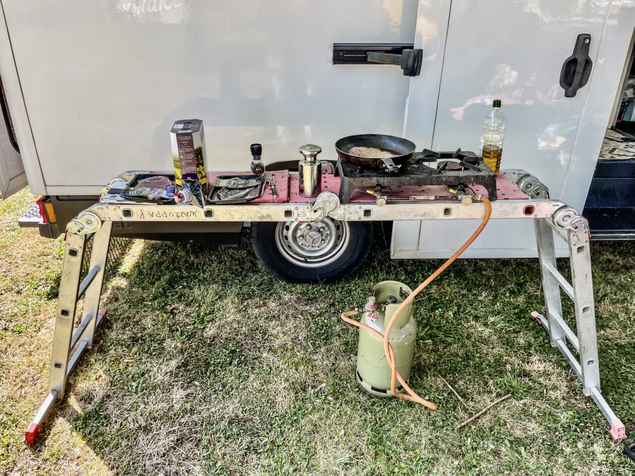Wij houden het simpel: water komt uit een jerrycan met een kraantje; de zwaartekracht doet zijn best. We gebruiken een losse tweepitsgasbrander en een Altrex-vouwladder waar we een simpele buitenkeuken van maken. Topkoffie komt uit een percolator en als het gas op is, koken we op een stoof met een gietijzeren pannetje dat we op de brocante hebben gekocht. Door heel Frankrijk zitten Emmaรผs-brocantes. Kijk even op de website van Emmaรผs voor de openingstijden; deze zijn nogal grillig te noemen.
