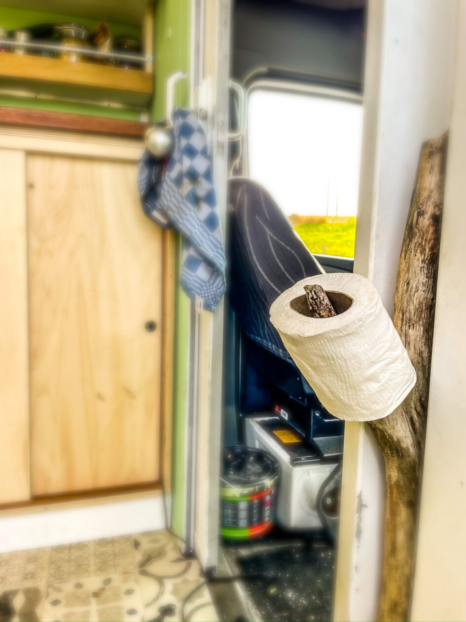 Je staat er thuis niet bij stil, maar het gegeven dat de wc-rol altijd op dezelfde plek hangt, zorgt toch voor een soort orde in de dagelijkse chaos van wat je leven heet. In een net ingetimmerde camper moet alles nog zijn plek krijgen. Tussen het sprokkelhout voor het kampvuur bleek een schitterende, door moeder natuur gemaakte tak te zitten die perfect was voor dit doel.
