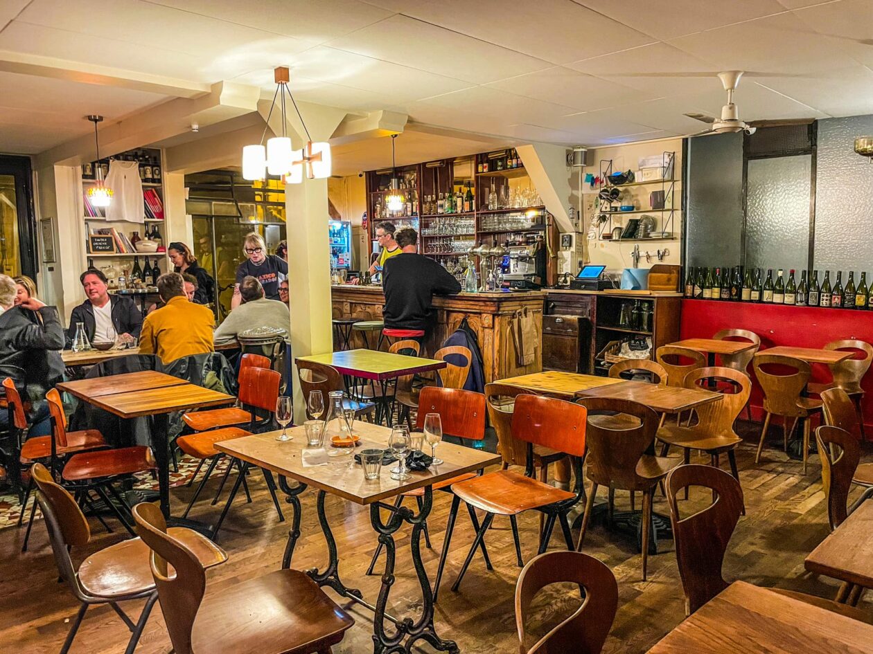 Ook in Au Passage wordt hard gewerkt: uit het minikeukentje komt een eindeloze hoeveelheid bordjes met lekkere happen, en de glazen worden royaal gevuld om de gerechten mee weg te spoelen. De muziek staat goddank zo zacht dat het geroezemoes, het gelach en de keukengeluiden er ruimschoots van winnen.