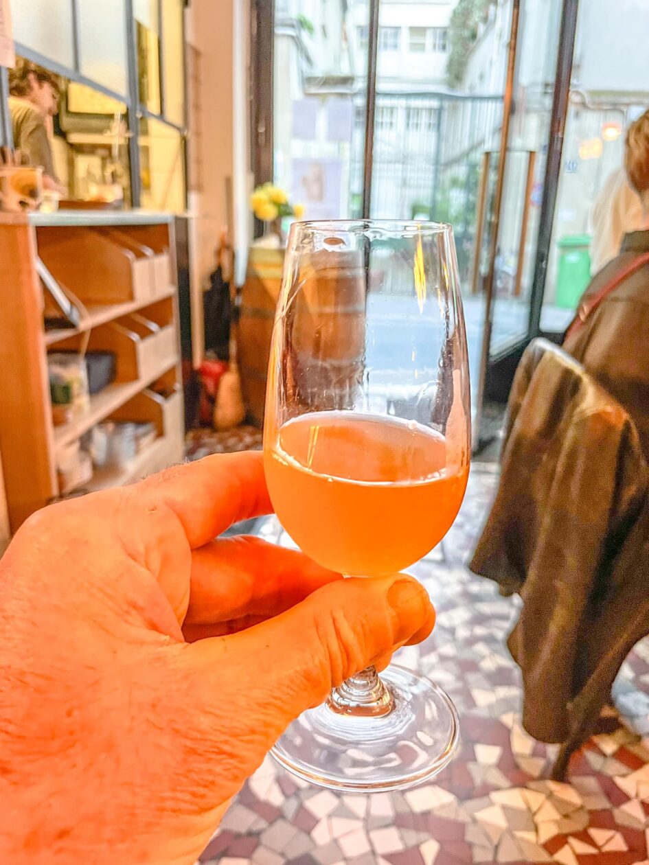 We drinken oranje wijn: lekker fris met een tinteling van de fermentatie. Dit is van oorsprong een Georgische manier van wijn maken; witte druiven worden met schil en pit langzaam vergist in een in de grond verzonken aardewerken pot.
