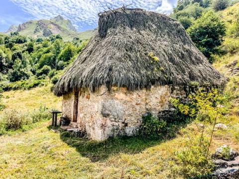 Spanje, Asturië, natuurgebied Somiedo. Vanaf zee (niveau 0) slingeren we gestaag door de kloof omhoog. De weg is ooit aangelegd zodat twee ezeltjes met hooi op hun rug elkaar kunnen passeren, wat ervoor zorgt dat we met een fijn sukkeldrafje de berg op hobbelen. Het is hier zo verbijsterend mooi, dat ik er af en toe aan moet denken om mijn mond dicht te doen.