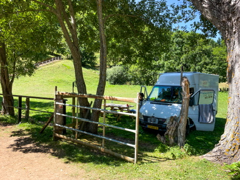 Even praktisch: Je kunt hier huisjes huren of met je camper of tent staan. Verder kun je paarden huren, een drankje doen in de bar met een simpele hap en er is een mini-supermarktje. De prijs per nacht voor de bus inclusief ons verblijf is € 25,-.