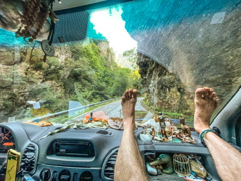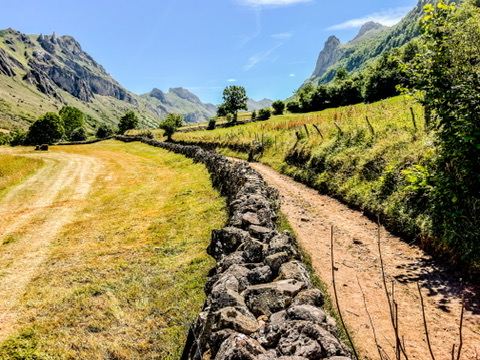 Spanje, Asturië, natuurgebied Somiedo. Vanaf zee (niveau 0) slingeren we gestaag door de kloof omhoog. De weg is ooit aangelegd zodat twee ezeltjes met hooi op hun rug elkaar kunnen passeren, wat ervoor zorgt dat we met een fijn sukkeldrafje de berg op hobbelen. Het is hier zo verbijsterend mooi, dat ik er af en toe aan moet denken om mijn mond dicht te doen.