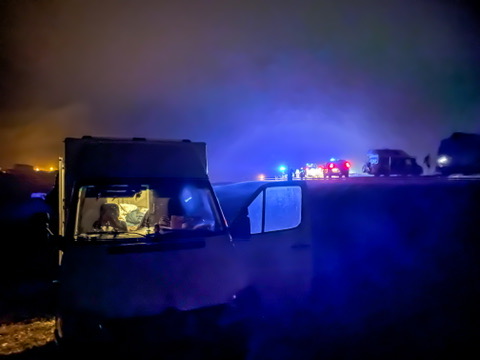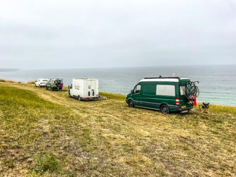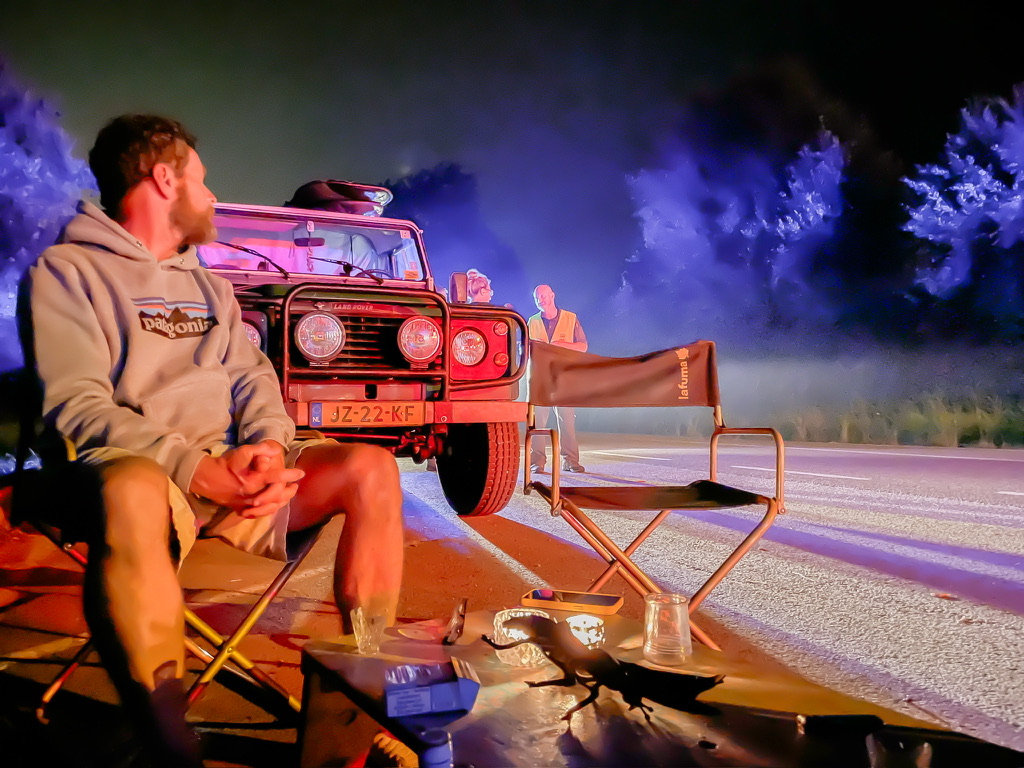 Ook iets later, op onze verse slaapplek op een parkeerplaats langs de kant van de weg met een slaapmutsje aan de lippen tegen de schrik, stopten de blauwe zwaailichten weer naast de Land Rover en de camper. Charme en een eilandersmentaliteit zijn mooie dingen: Marlies redde de nacht “zoals een vrouw alleen” (vrij naar De Dijk).