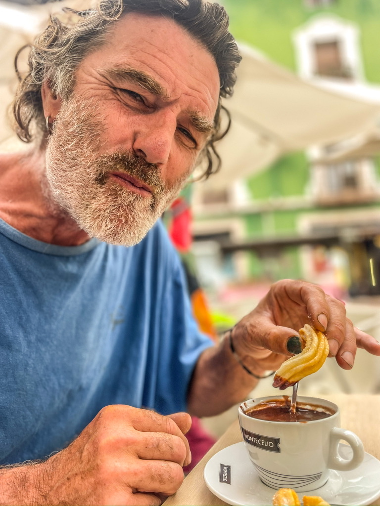 Asturias – zondagsmarkt in Grado – wij dachten dat Spanje altijd een diep religieus land was die de zondagsrust en kerkgang ernstig namen – hier in Grado wordt daar anders over gedacht of mee omgegaan – boeren/bakkers/slagers en andere marktlui staan daar uit volle borst hun waar aan te prijzen – Churros con chocolate is een fijn happie als je smorgens in de schaduw zit – kop met dikke chocolademelk waar je je verse churros in doopt en weg kauwt onder de goed keurende blik van de Spaanse buren – om het sprookje af te maken ,op de hoek een muzikant die hemels speelt en zingt – zondag in Spanje is fijn –
