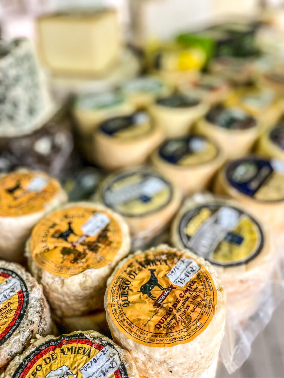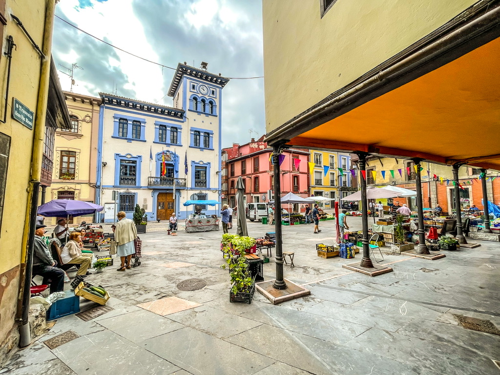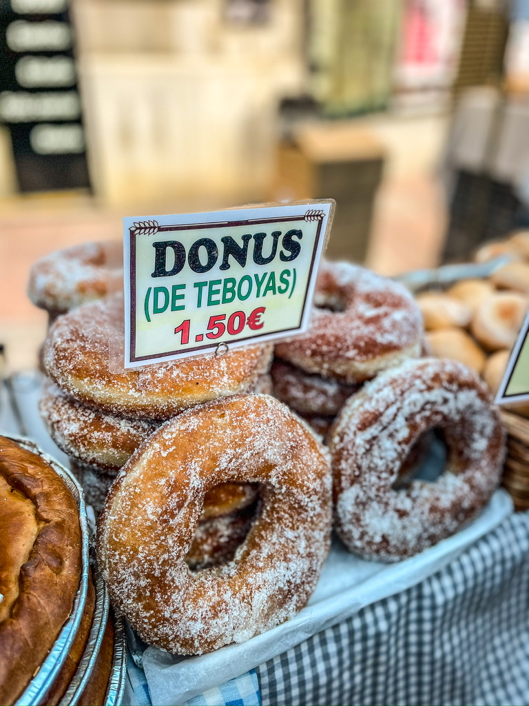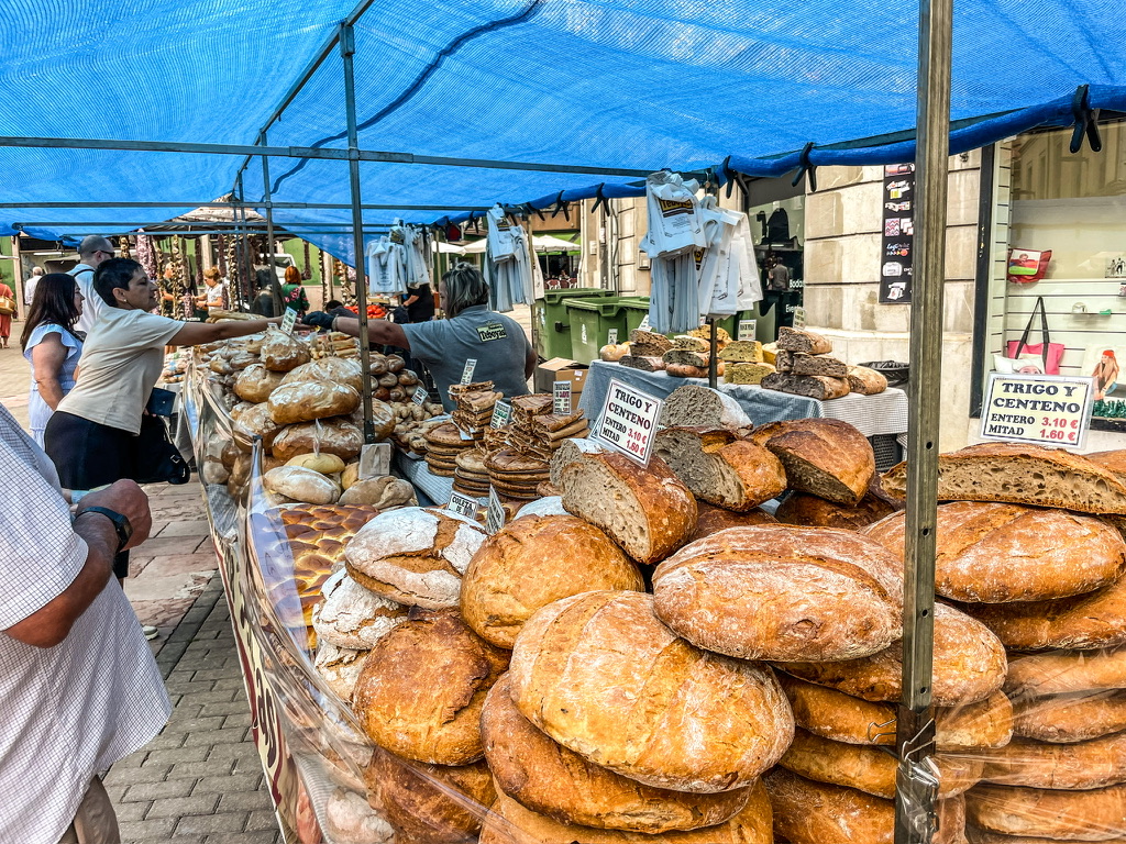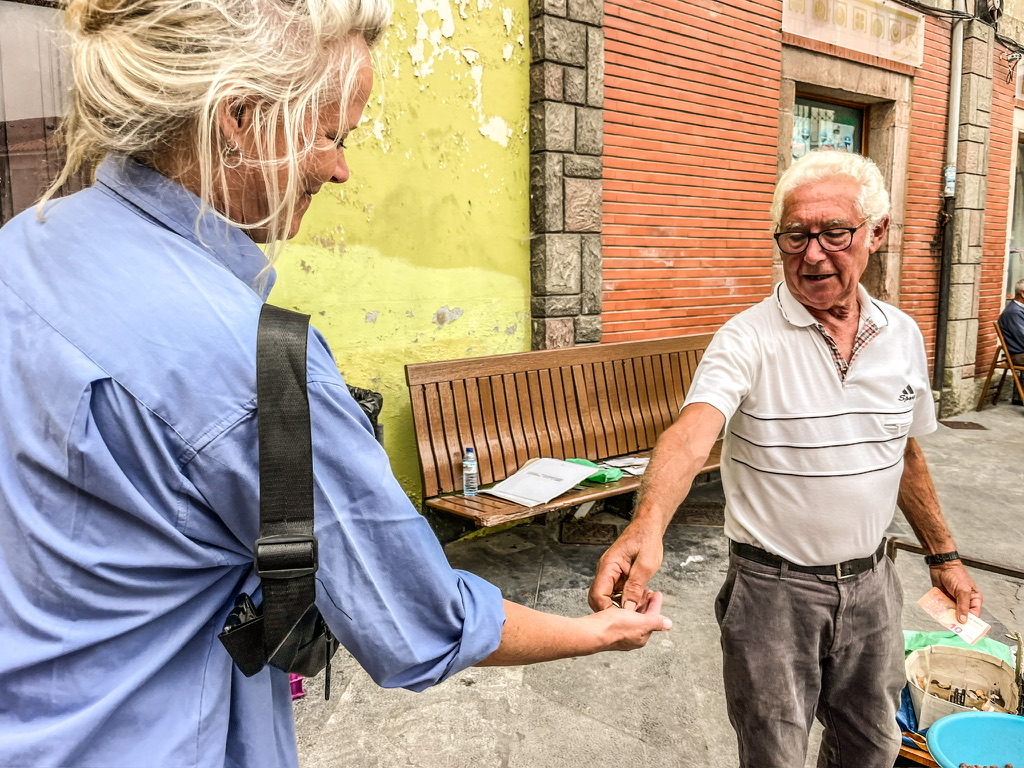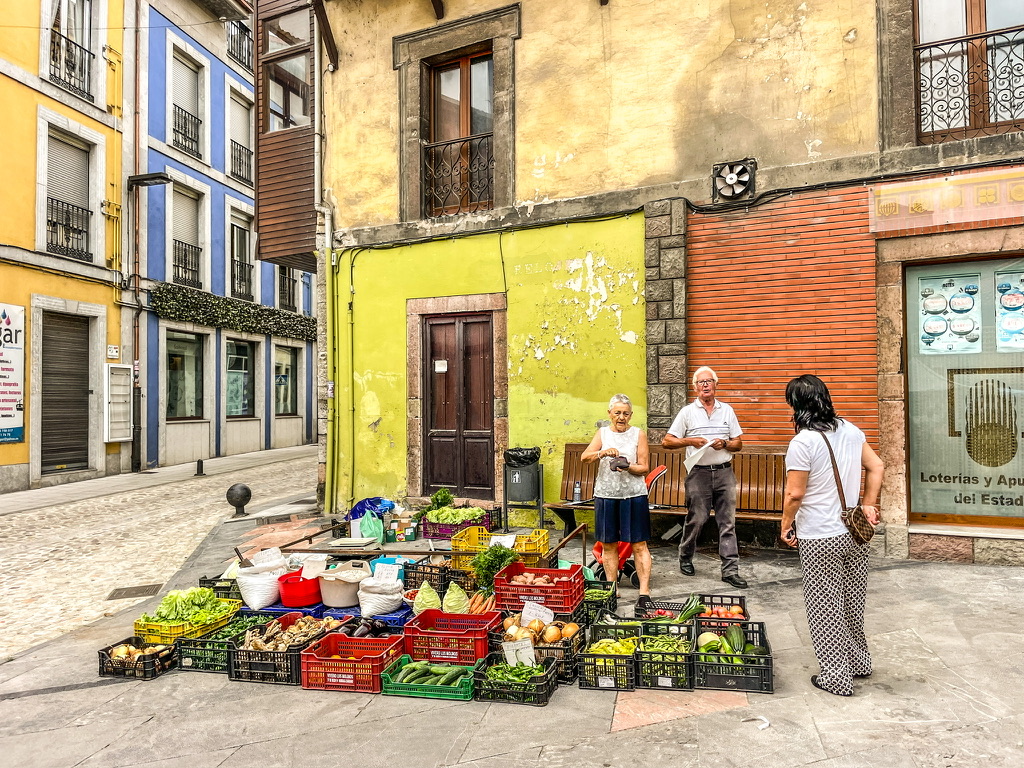 Asturias – zondagsmarkt in Grado – wij dachten dat Spanje altijd een diep religieus land was die de zondagsrust en kerkgang ernstig namen – hier in Grado wordt daar anders over gedacht of mee omgegaan – boeren/bakkers/slagers en andere marktlui staan daar uit volle borst hun waar aan te prijzen – Churros con chocolate is een fijn happie als je smorgens in de schaduw zit – kop met dikke chocolademelk waar je je verse churros in doopt en weg kauwt onder de goed keurende blik van de Spaanse buren – om het sprookje af te maken ,op de hoek een muzikant die hemels speelt en zingt – zondag in Spanje is fijn –