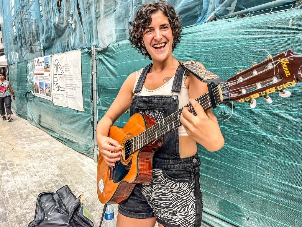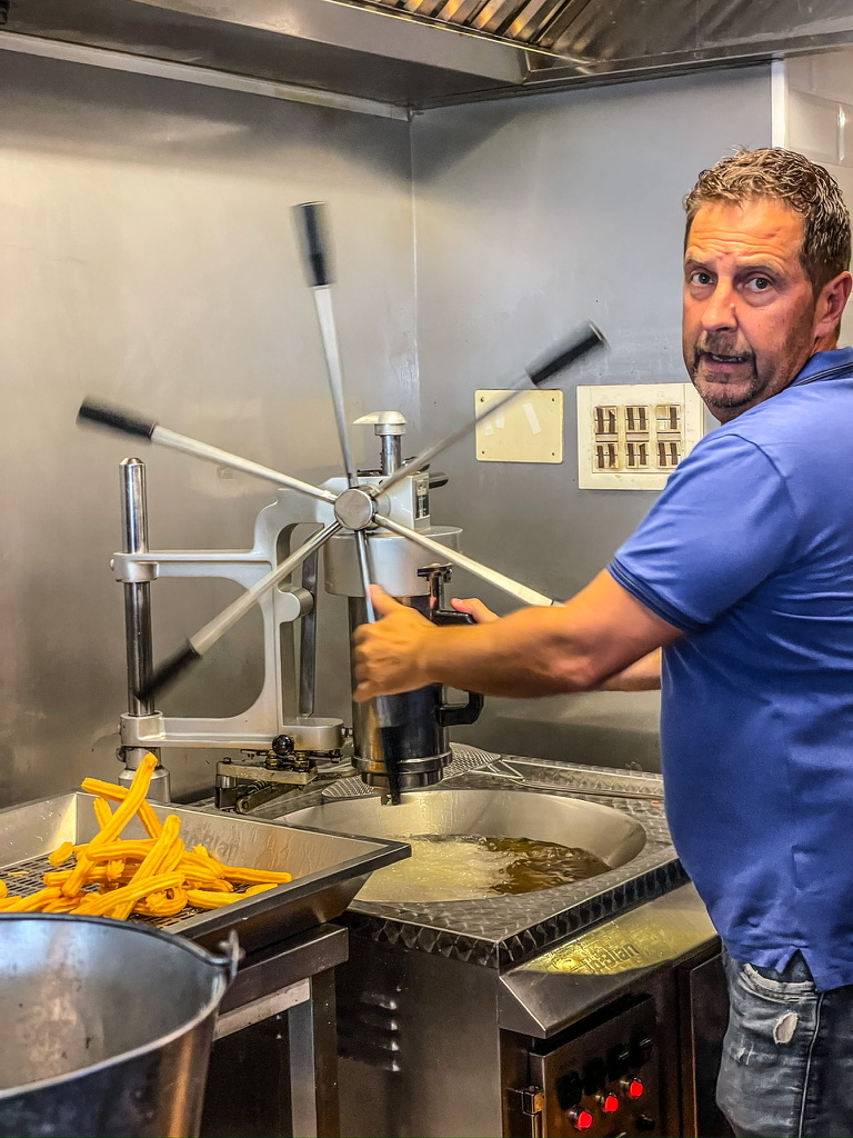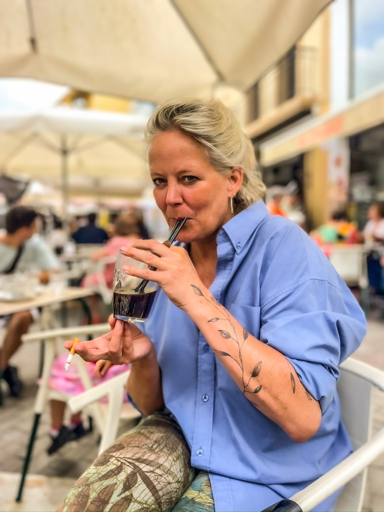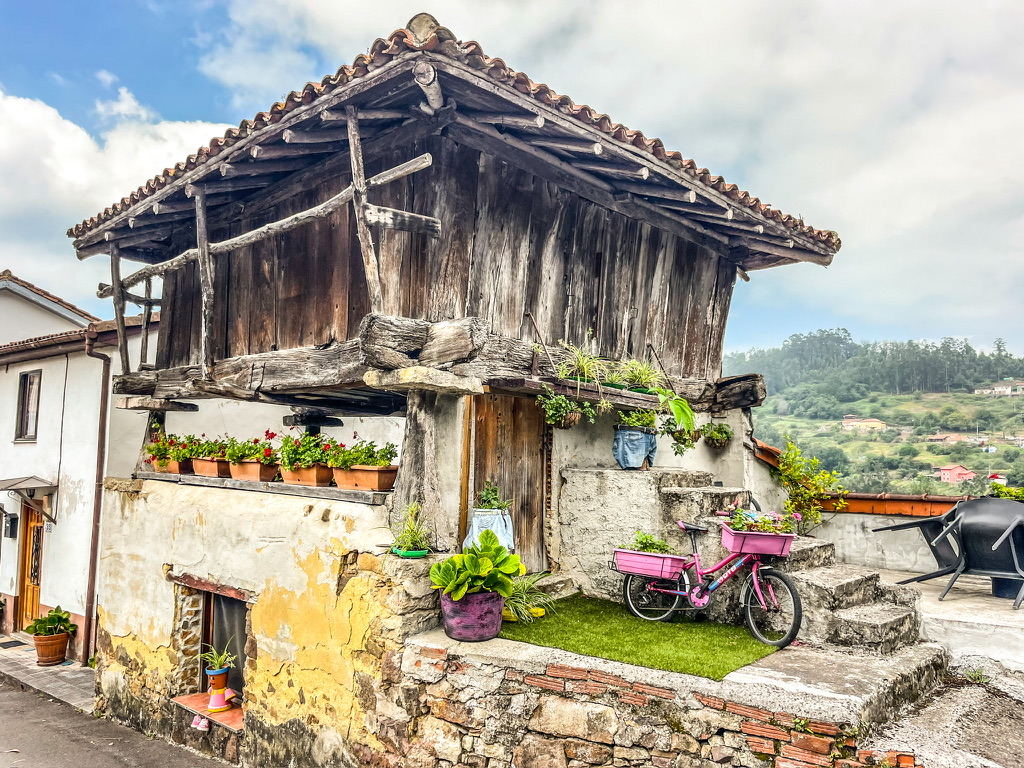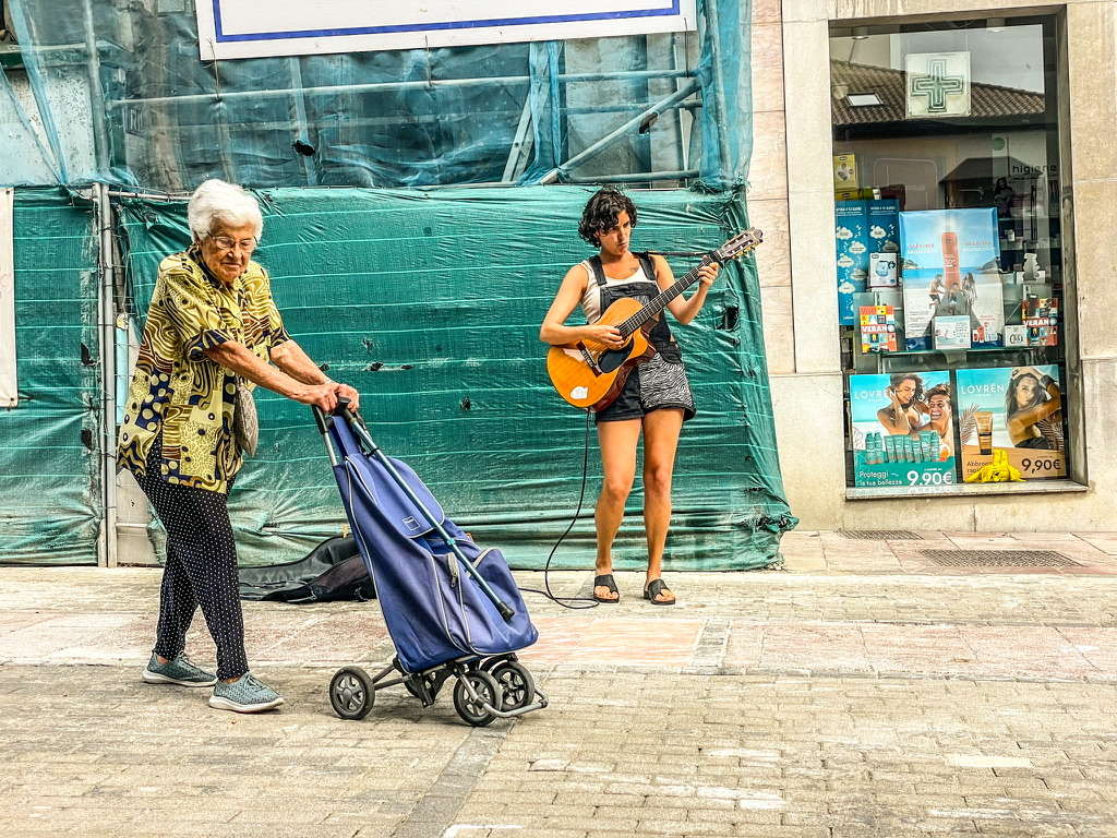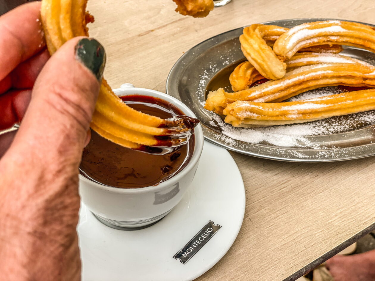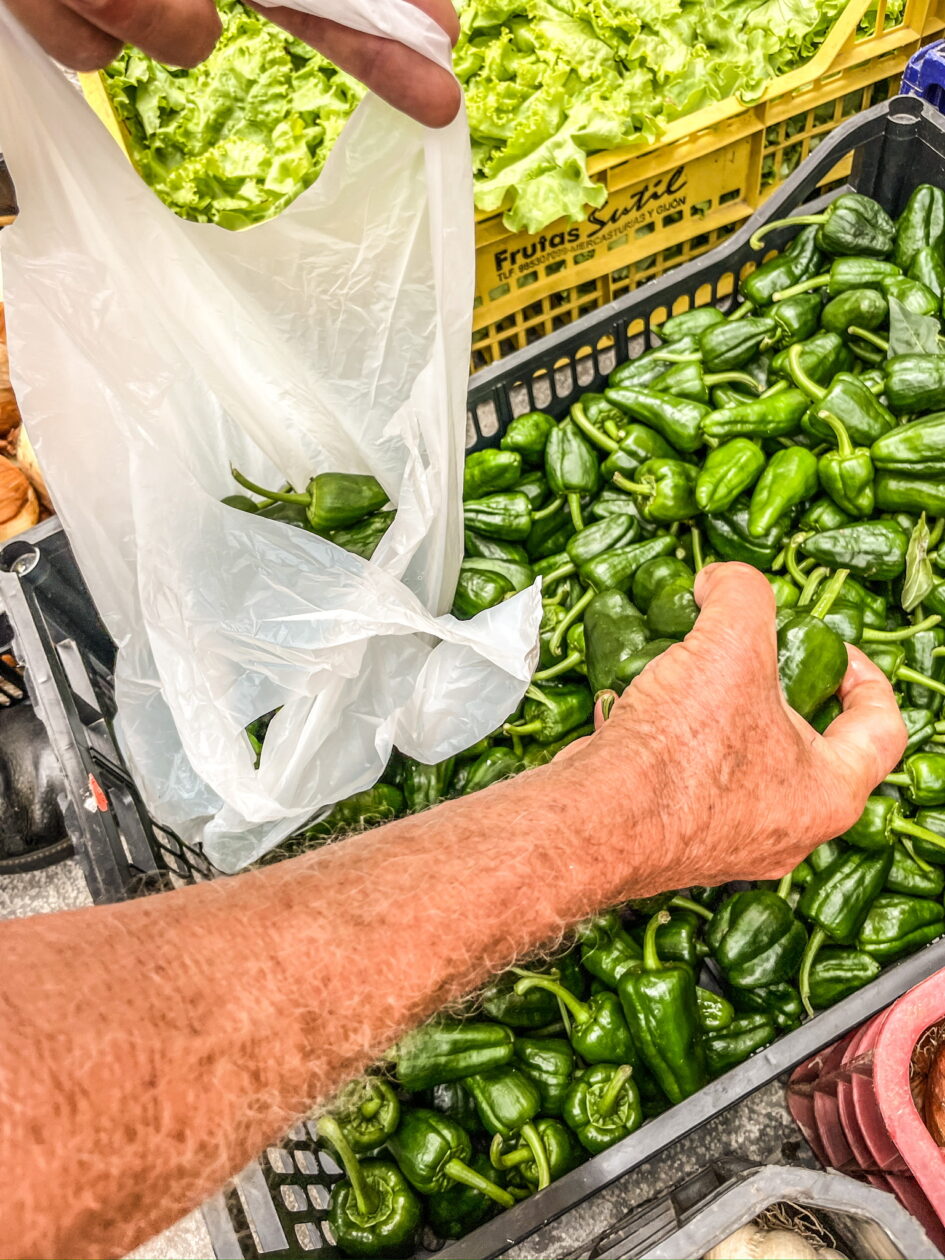 Asturias – zondagsmarkt in Grado – wij dachten dat Spanje altijd een diep religieus land was die de zondagsrust en kerkgang ernstig namen – hier in Grado wordt daar anders over gedacht of mee omgegaan – boeren/bakkers/slagers en andere marktlui staan daar uit volle borst hun waar aan te prijzen – Churros con chocolate is een fijn happie als je smorgens in de schaduw zit – kop met dikke chocolademelk waar je je verse churros in doopt en weg kauwt onder de goed keurende blik van de Spaanse buren – om het sprookje af te maken ,op de hoek een muzikant die hemels speelt en zingt – zondag in Spanje is fijn –