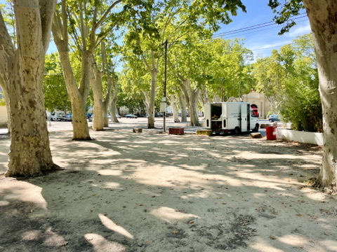 Frankrijk / Beaucaire – aan de rand van de stad , naast de Rhône staat een enorm park met statige platanen- ze zorgen voor koelte door hun bladerdek , daarnaast zijn ze prachtig Frans en vormen het dak van het Petangue veld –