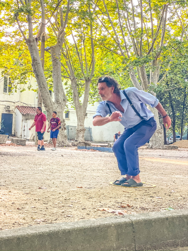 In de lome namiddag in mooi gefilterd licht word er petanque gespeeld – de ballen vallen met een fijne plof in het speelveld of worden met venijn en een stalen kets weggespeeld – bij twijfel word het meetlint gepakt en kijkt iedereen serieus – er is ook lol , want we worden uitgenodigd om mee te spelen – blijkt er ineens dat er allerlei regels en spelmethoden zijn – geen paniek, tis overzichtelijk leuk en vergt nog jaren van oefening -we kunnen alleen maar vooruit –