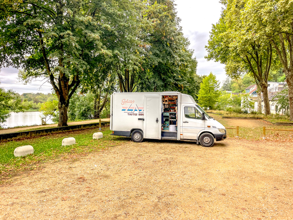Tijdens het wroeten om los te komen, zagen we aan de overkant een potentiรซle overnachtingsplek. Na een uur zwoegen schoot de bus eindelijk los uit zijn zandgraf. Bezweet reden we over de brug naar Saint-Satur, aan de oever van de Loire. Een fantastische plek, direct aan de rivier en in de schaduw van het dorp, met uitzicht op de brug waar we eerst nog onder vaststonden. En dat alles met een fijne boulangerie op loopafstand. We wisselden de rivier af met de schaduw van de bus en waren diep tevreden met deze dag.