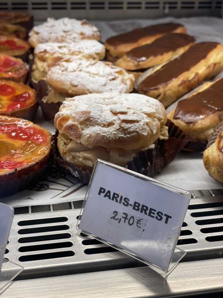 We dronken koffie op een bankje dat de gemeente daar vriendelijk voor ons had neergezet. Daarna pakten we de bus in en zetten alles vast wat los kon schieten. De eerste stop was een boulangerie. Ik vind het heerlijk om met bijvoorbeeld een รฉclair of andere zoetigheid te ontbijten; dit keer leek de Paris-Brest me een goed idee.