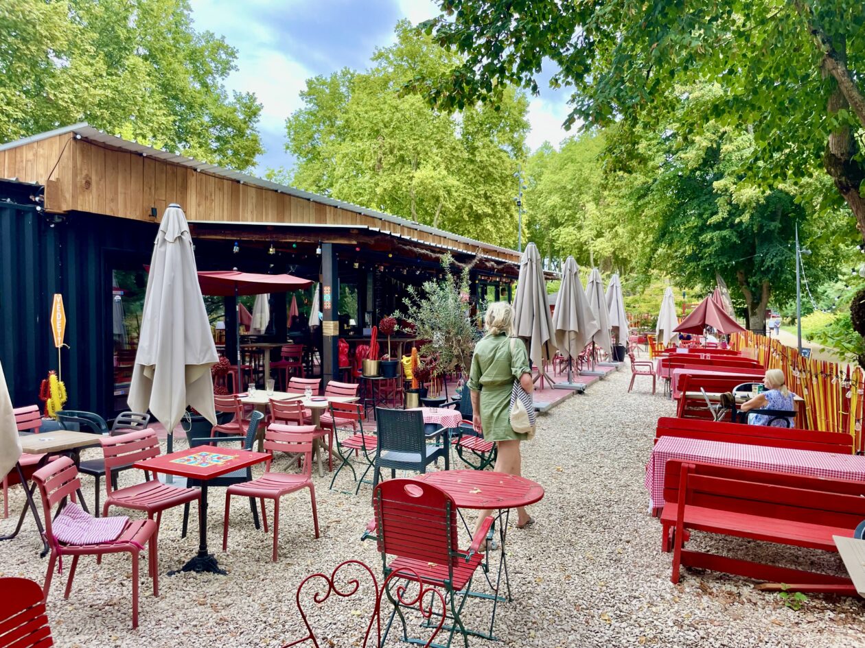 Wonderlijke naam voor een gebakje, even checken op Google… Hier komt-ie: de Paris-Brest werd in 1910 bedacht door een Franse bakker ter ere van de wielrenwedstrijd Paris-Brest. Vandaar de ronde vorm, die een fietswiel moet voorstellen. Het is een soort soes, rijkelijk gevuld met pralinécrème. Een aanrader, hoewel een éclair café ook heel goed samengaat met een kop koffie en een traag stromende rivier.
