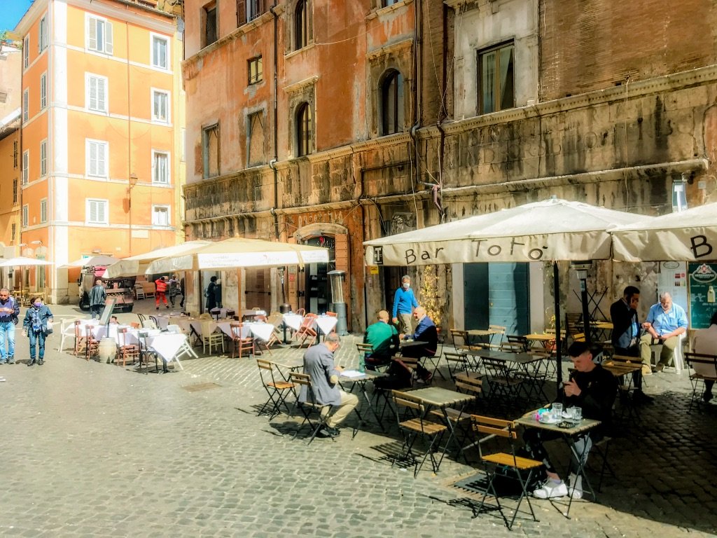 Omdat we toeristen zijn racen we op de step over de kasseien naar de Sint Pieter / Colosseum  / Spaanse trappen / Trevi fontein en naar  Giolitti  volgens sommige de beste ijsmakers van Rome maar in ieder geval de oudste en prachtig qua architectuur – ik ga er geen ruzie om maken – De stad is nagenoeg leeg – Covid heeft zijn werk gedaan – we staan overal met onze neus bovenop en van rijen bij de bekendste toeristische trekpleister is geen sprake – Bij de Trevi fontein hadden we ruim baan om over je schouder een muntje in de Fontein te mikken – ja man – we zijn tenslotte toeristen en daarnaast betekend een goed gemikt muntje in het water dat je absoluut terugkeert naar de eeuwige stad – Qua eten en drinken – In travesteer struikel je over de fijne restaurantjes te veel om op te noemen en te heerlijk om door te vertellen – Ergens in de binnenstad werden we door een insmijter vakkundig de binnentuin bij Vos binnengelokt  – zittend met een menu kaart op schoot en drankje aan de lip schoten we in de lach van zoveel insmijt talent – Rome – we komen dus terug