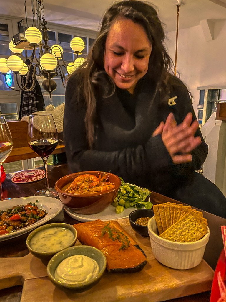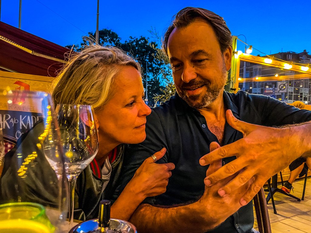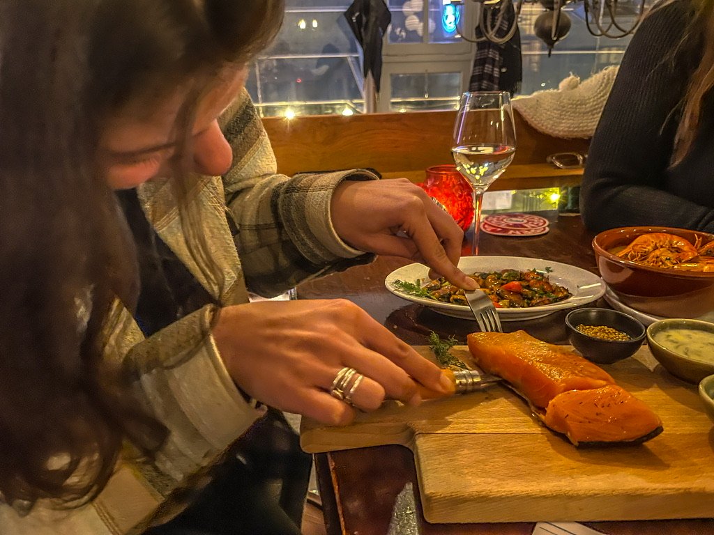 Amsterdam – Bar aan de Kade – de avond valt in amsterdam- het vriest- de straten glinsteren van de ijskristallen – holiday on ice – Oliebollenkramen / kerstbomen / kerstverlichting in de winkelstraten – de stad als kerstboom –   In Bar aan de kade rookt eigenaar Mark z’n zalmen – koud roken verduidelijk hij , en blaast op de rookdoos – de zalmen hangen – vaste gasten komen handenwrijvend binnen – sjaals/ muts  en handschoenen worden uitgepeld – Ober!  een bier en een rode wijn en een plank vers gerookte zalm –